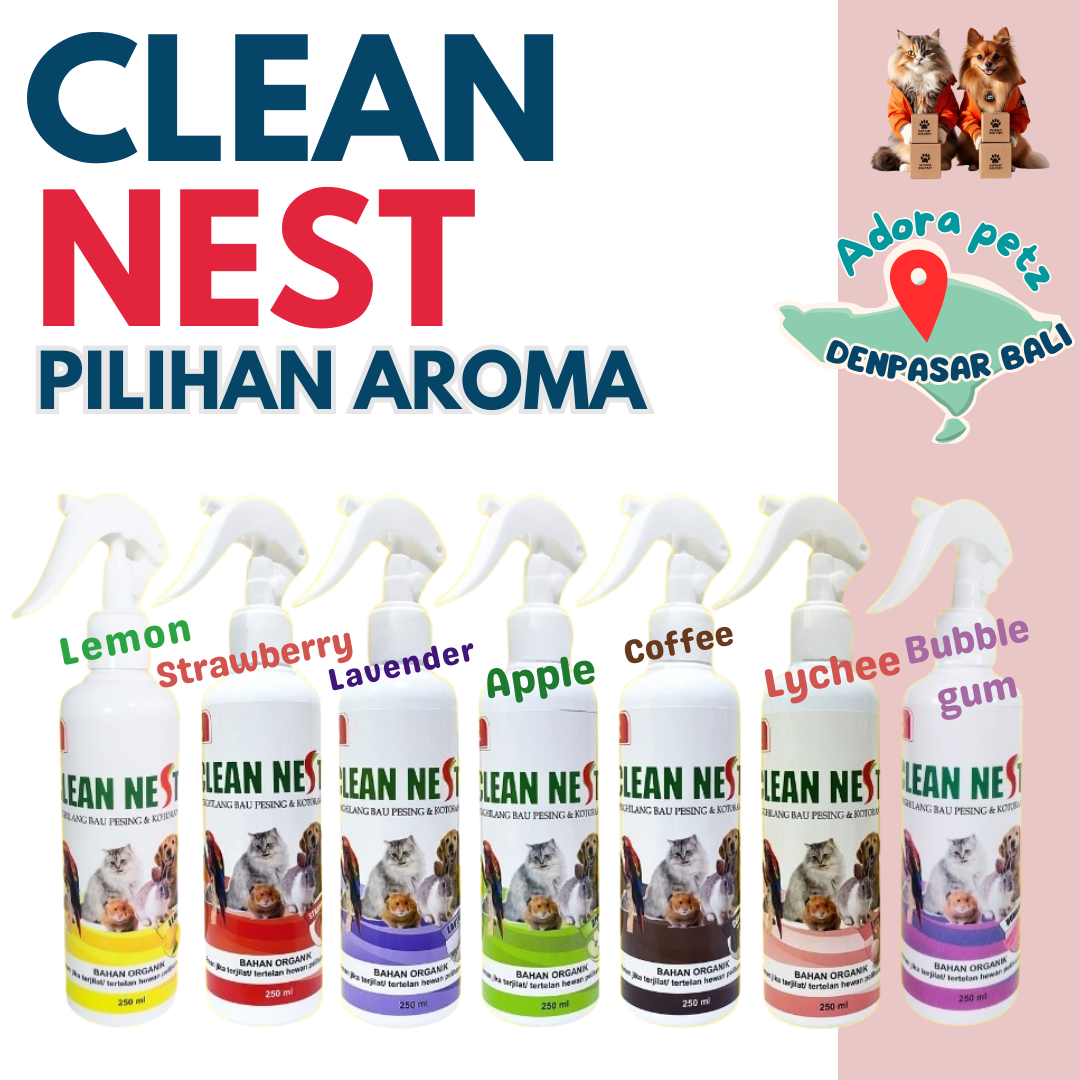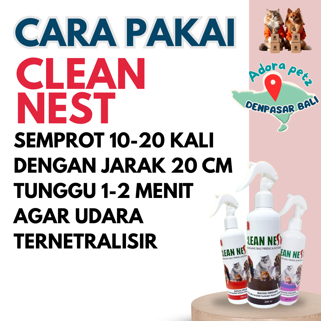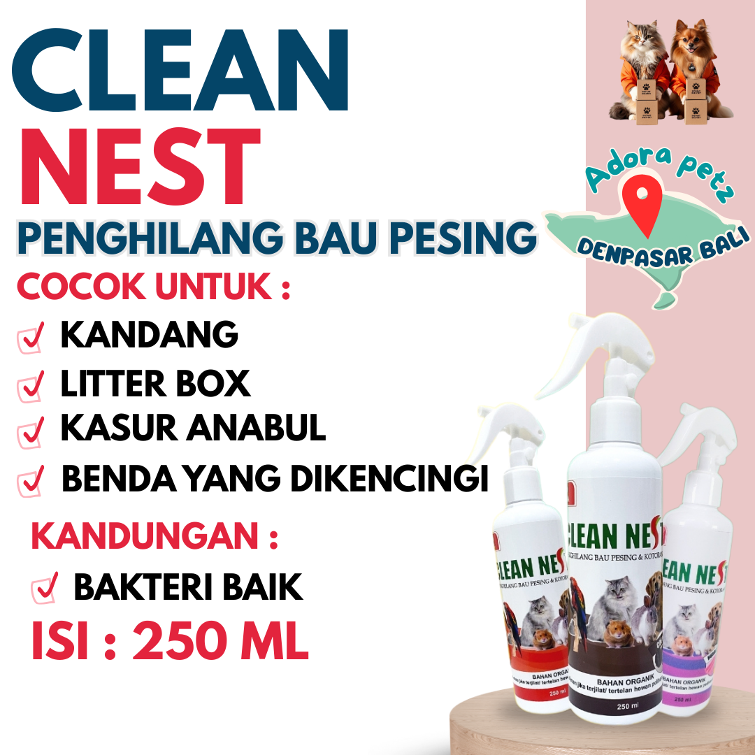 Clean nest merupakan penetral bau pesing dan bau tak sedap yang di timbulkan oleh bakteri dan kuman. Terbuat dari bahan konsetrat organik yang difermentasikan sehingga menghasilkan Saccharomyces cerevisiae, Lactobacillus casei, Rhodopseudomonas palustris, yaitu bakteri baik yang mampu membunuh bakteri penyebab bau tak sedap yang ditimbulkan oleh kotoran hewan peliharaan.