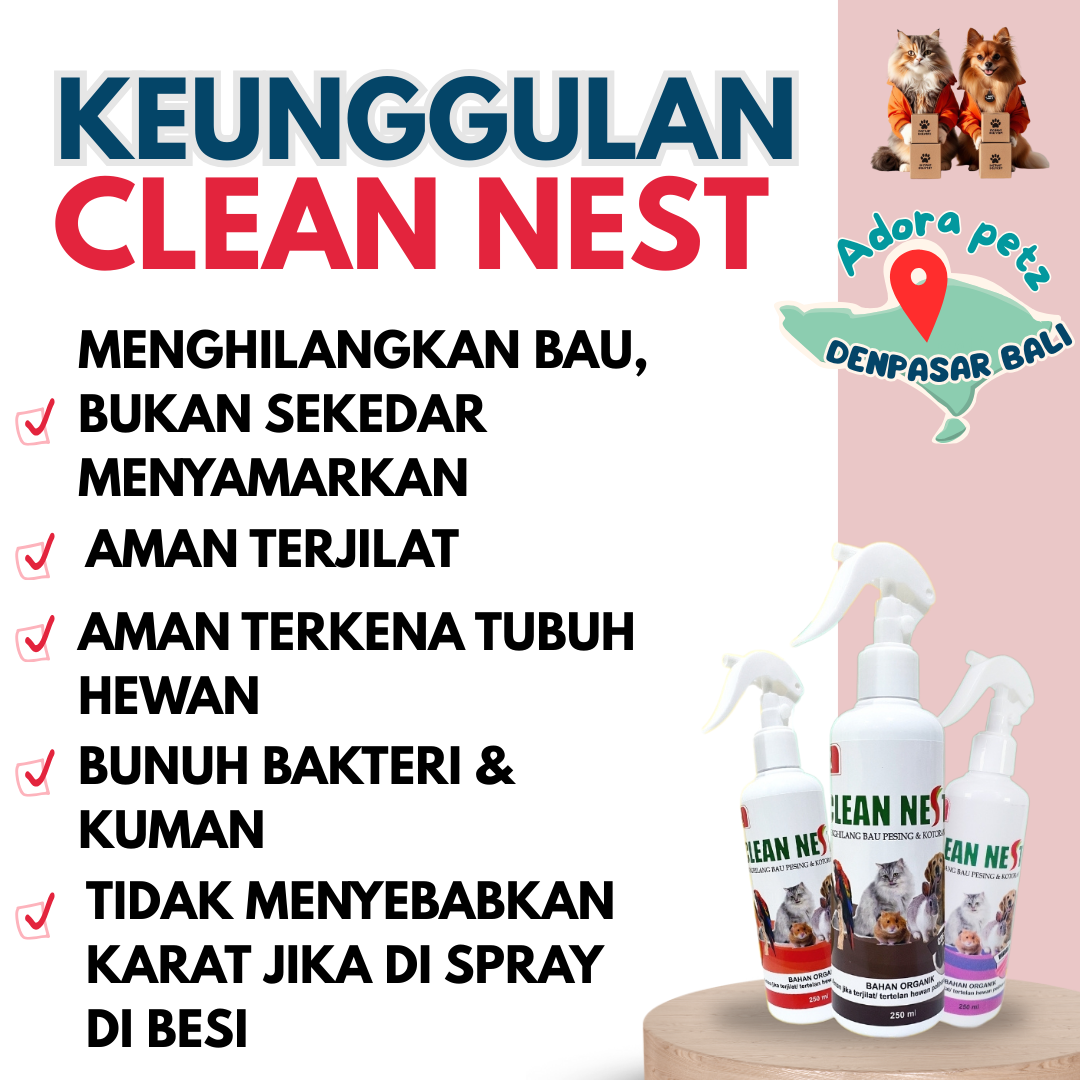 ![Clean Nest Penghilang Bau Pesing Kandang Kucing Anjing Kelindi [Adora Petz] - Image 3](https://adorapetz.id/wp-content/uploads/2026/03/keunggulan-review-clean-nest.png)