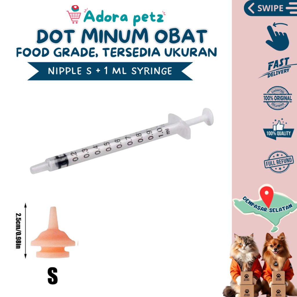 Hai para pecinta kucing dan anjing! Pernah nggak sih 𝗸𝗲𝘀𝘂𝗹𝗶𝘁𝗮𝗻 𝗻𝗴𝗮𝘀𝗶𝗵 𝗼𝗯𝗮𝘁 atau 𝘀𝘂𝘀𝘂 ke hewan peliharaan kesayangan? Nah, sekarang ada solusinya nih: 𝗠𝗲𝗱𝗶𝗰𝗶𝗻𝗲 𝗗𝗿𝗼𝗽𝗽𝗲𝗿 𝗦𝘆𝗿𝗶𝗻𝗴𝗲 𝗳𝗼𝗿 𝗣𝗲𝘁 𝗙𝗲𝗲𝗱𝗶𝗻𝗴. Alat ini dirancang khusus buat kamu yang pengen ngasih susu, makan, obat cair ke anak kucing atau anjing dengan mudah dan aman.nn𝗞𝗲𝗻𝗮𝗽𝗮 𝗵𝗮𝗿𝘂𝘀 𝗽𝘂𝗻𝘆𝗮 𝗮𝗹𝗮𝘁 𝗶𝗻𝗶?n- 𝗔𝗺𝗮𝗻 𝗱𝗮𝗻 𝗧𝗮𝗵𝗮𝗻 𝗟𝗮𝗺𝗮: Terbuat dari bahan silikon food-grade yang bebas bau, jadi aman banget buat kitten puppy yang baru lahirn- 𝗣𝗲𝗻𝗴𝘂𝗸𝘂𝗿𝗮𝗻 𝗔𝗸𝘂𝗿𝗮𝘁: Ada skala ukurannya, jadi kamu bisa ngasih dosis yang pas tanpa khawatir kelebihan atau kekurangan.n- 𝗗𝗲𝘀𝗮𝗶𝗻 𝗘𝗿𝗴𝗼𝗻𝗼𝗺𝗶𝘀: Pegangannya didesain khusus biar nggak licin saat digunakan, jadi kamu bisa ngasih makan tanpa takut tumpah atau melukai hewan peliharaanmu.nn- 𝗨𝗷𝘂𝗻𝗴 𝗟𝗲𝗺𝗯𝘂𝘁: Dilengkapi dengan ujung pacifier yang lembut, cocok banget buat mulut kecil anak kucing atau anjing, dan mengurangi risiko cedera.nn𝙎𝙥𝙚𝙨𝙞𝙛𝙞𝙠𝙖𝙨𝙞 𝙋𝙧𝙤𝙙𝙪𝙠:n- Bahan: PVC dan silikon food-graden- Kapasitas: Tersedia dalam beberapa ukuran sesuai kebutuhanmun- Cocok untuk: Anak kucing, anak anjing, dan hewan kecil lainnyannProduk ini dikirim langsung dari Denpasar Selatan, Bali, jadi pengiriman ke seluruh Indonesia terutama Indonesia Tengah dan Timur bisa lebih cepat dan efisien. Jangan sampai hewan peliharaanmu kesulitan minum obat atau susu lagi. nDengan 𝗠𝗲𝗱𝗶𝗰𝗶𝗻𝗲 𝗗𝗿𝗼𝗽𝗽𝗲𝗿 𝗦𝘆𝗿𝗶𝗻𝗴𝗲 𝗳𝗼𝗿 𝗣𝗲𝘁 𝗙𝗲𝗲𝗱𝗶𝗻𝗴, pluit dot anabul semuanya jadi lebih mudah dan praktis!nnYuk, segera dapatkan alat praktis minum obat dan minum susu untuk kucing anjing ini dan berikan perawatan terbaik untuk hewan kesayanganmu!