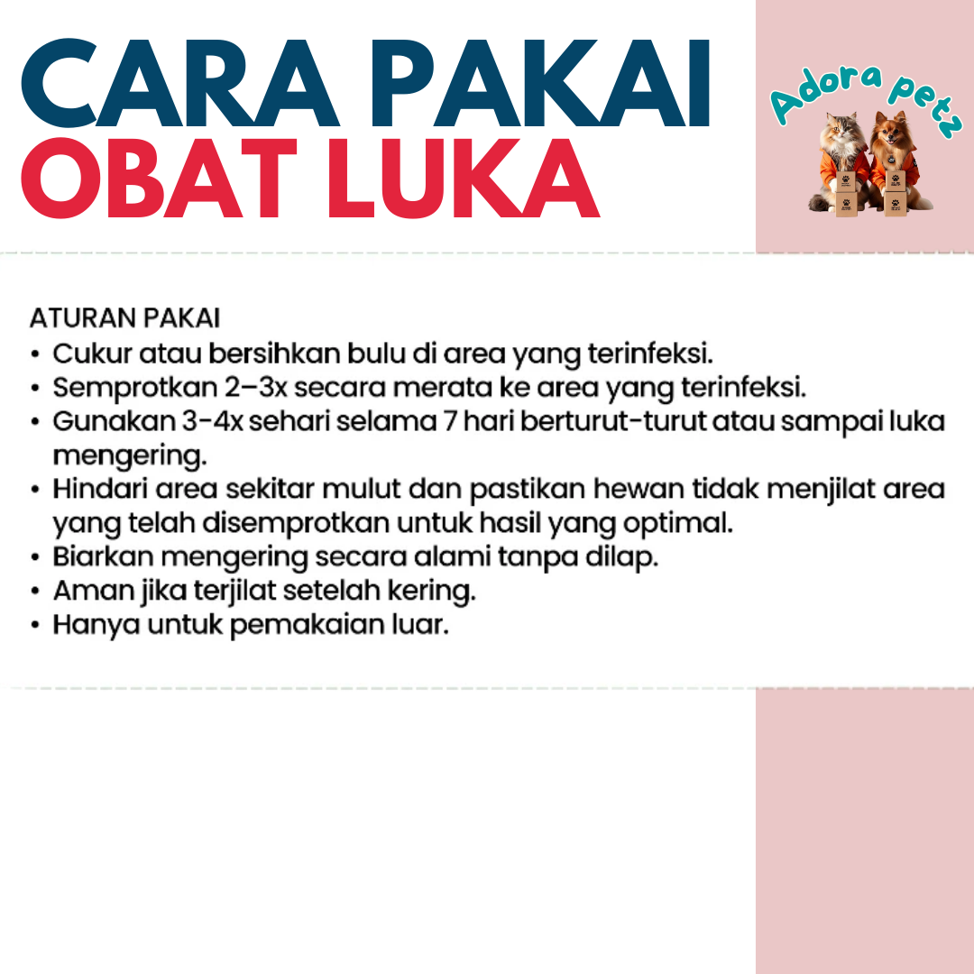 – Hindari area mulut & pastikan anabul tidak menjilat sebelum kering