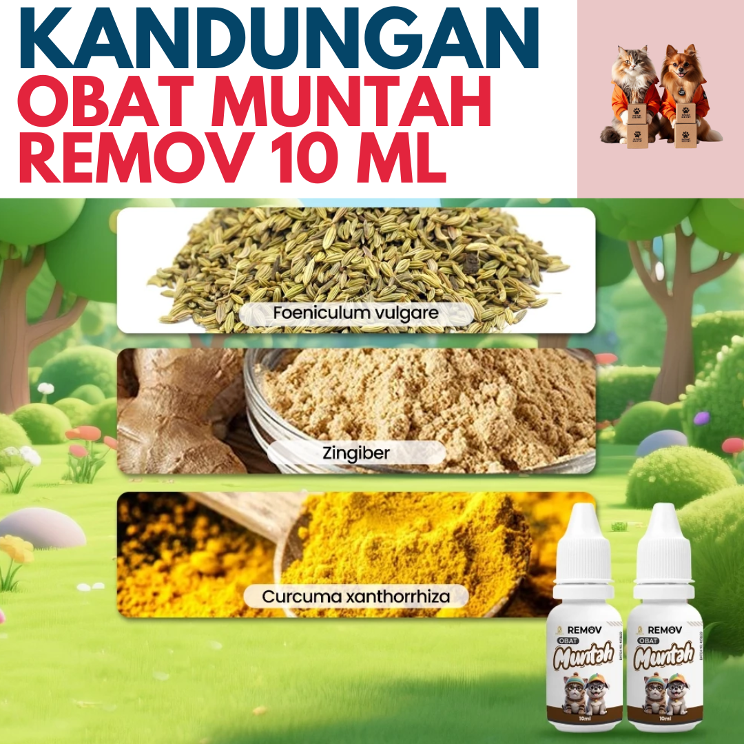 Untuk membantu meredakan gejala muntah dengan lebih aman, REMOV hadir menggunakan formulasi herbal yang bekerja menenangkan perut dan membantu mengurangi rangsangan muntah. Kombinasi bahan seperti Foeniculum vulgare, Zingiber, Curcuma Zanthorrhiza, Alpinia Galanga, Cinnamomum Burmanni, dan Phyllanthus Niruri mendukung pemulihan lebih alami tanpa membuat hewan lemas.