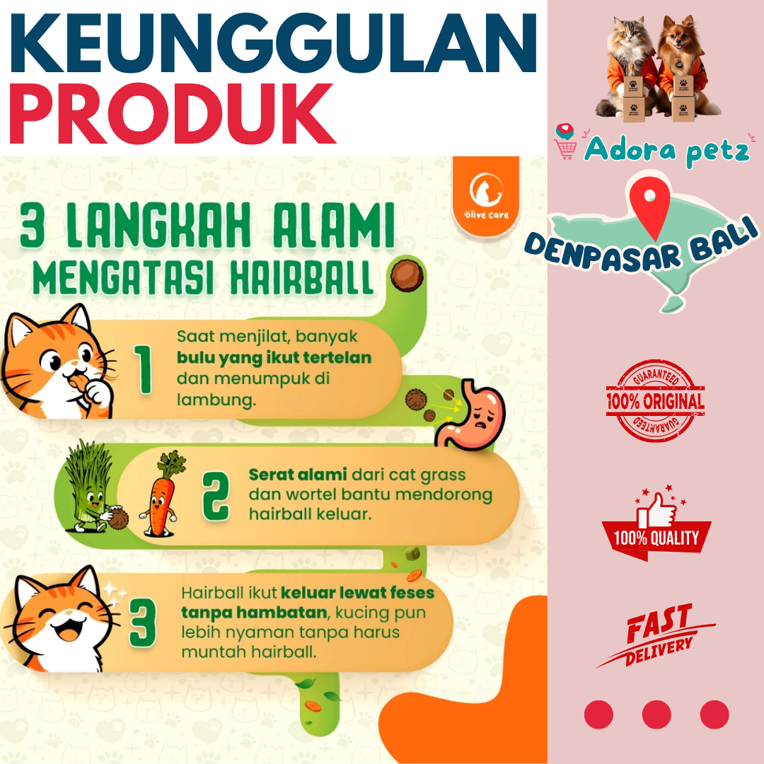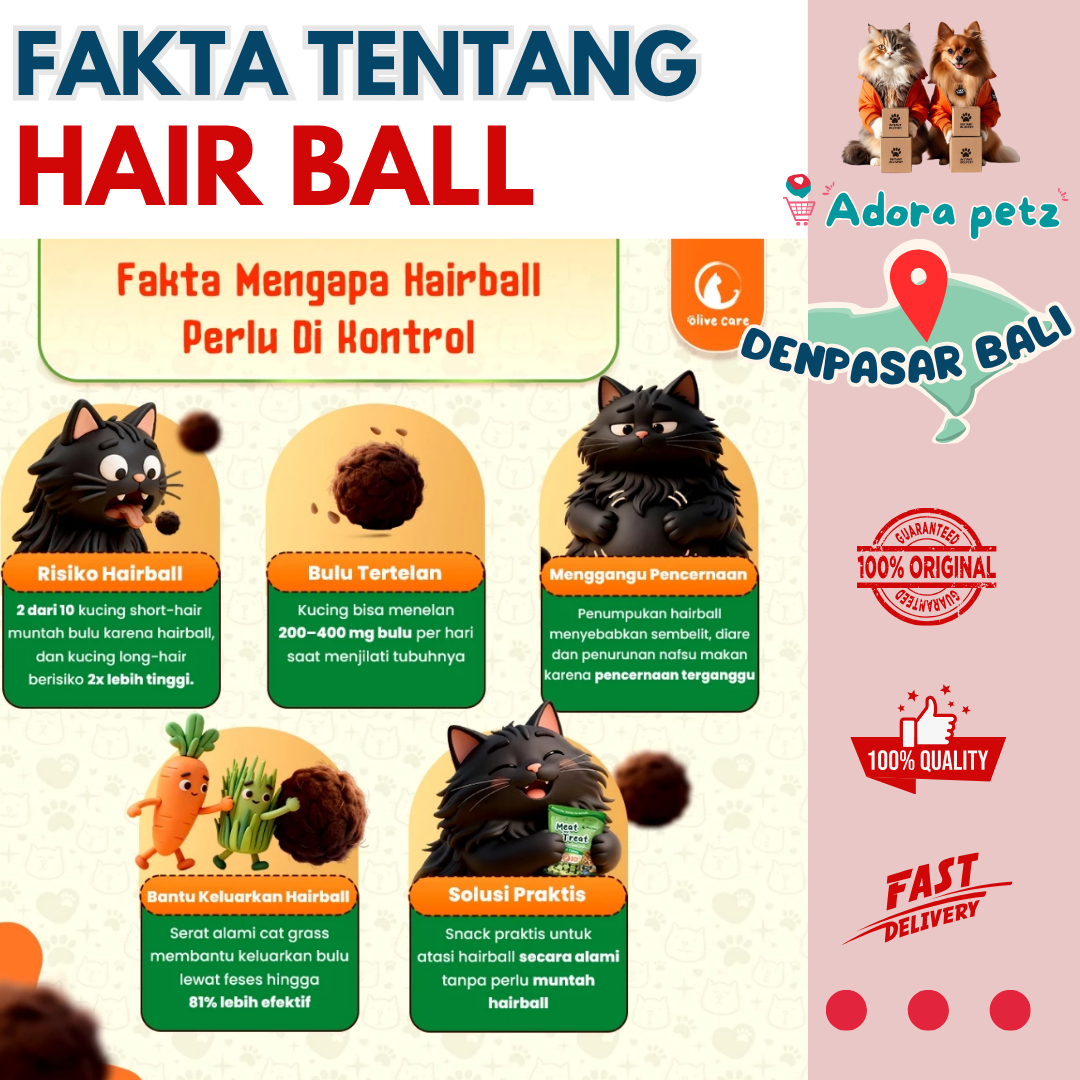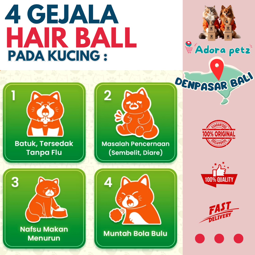 *Hairball masih bisa dikeluarkan melalui muntahan jika penumpukan sudah terlalu banyak.